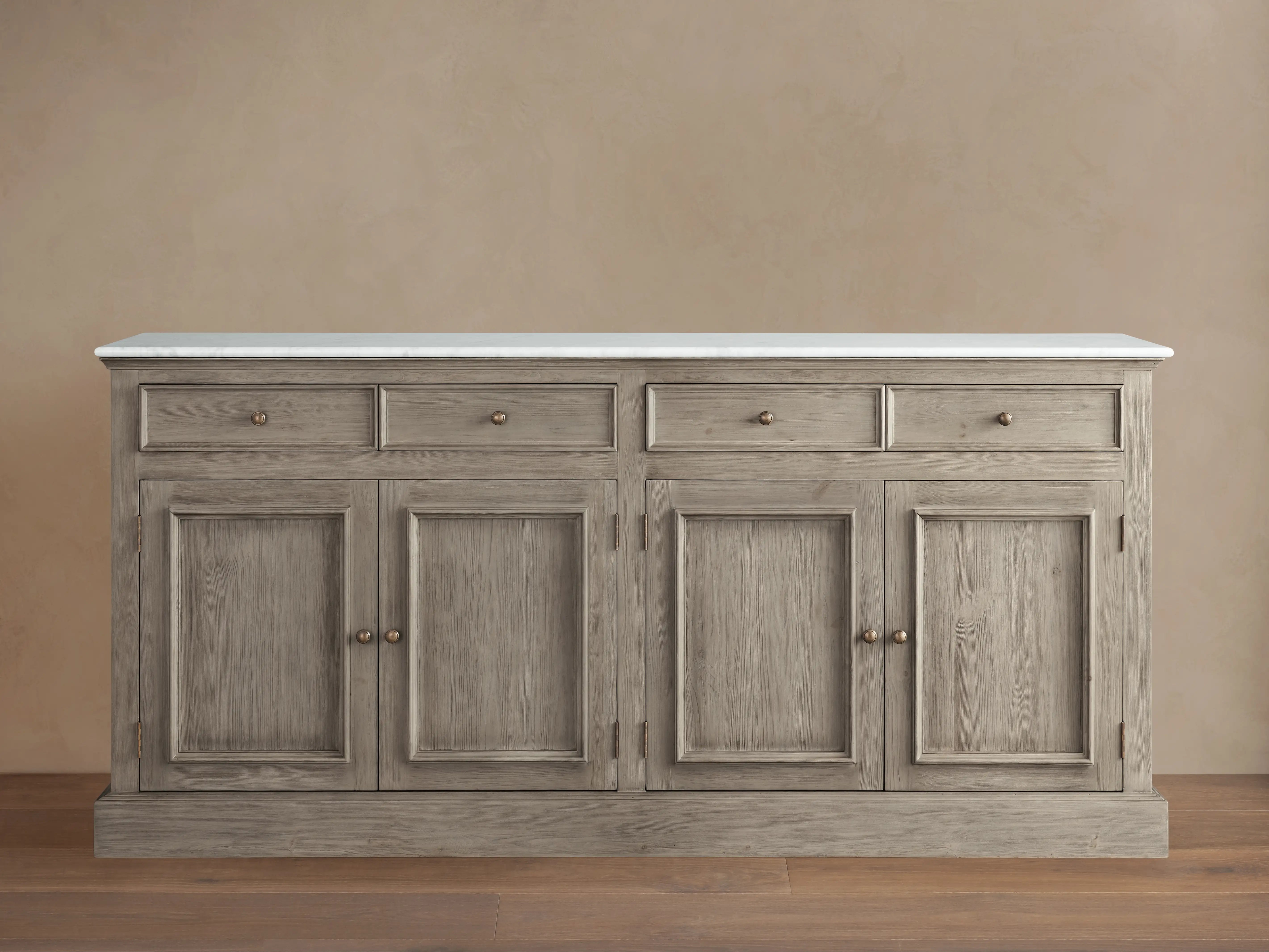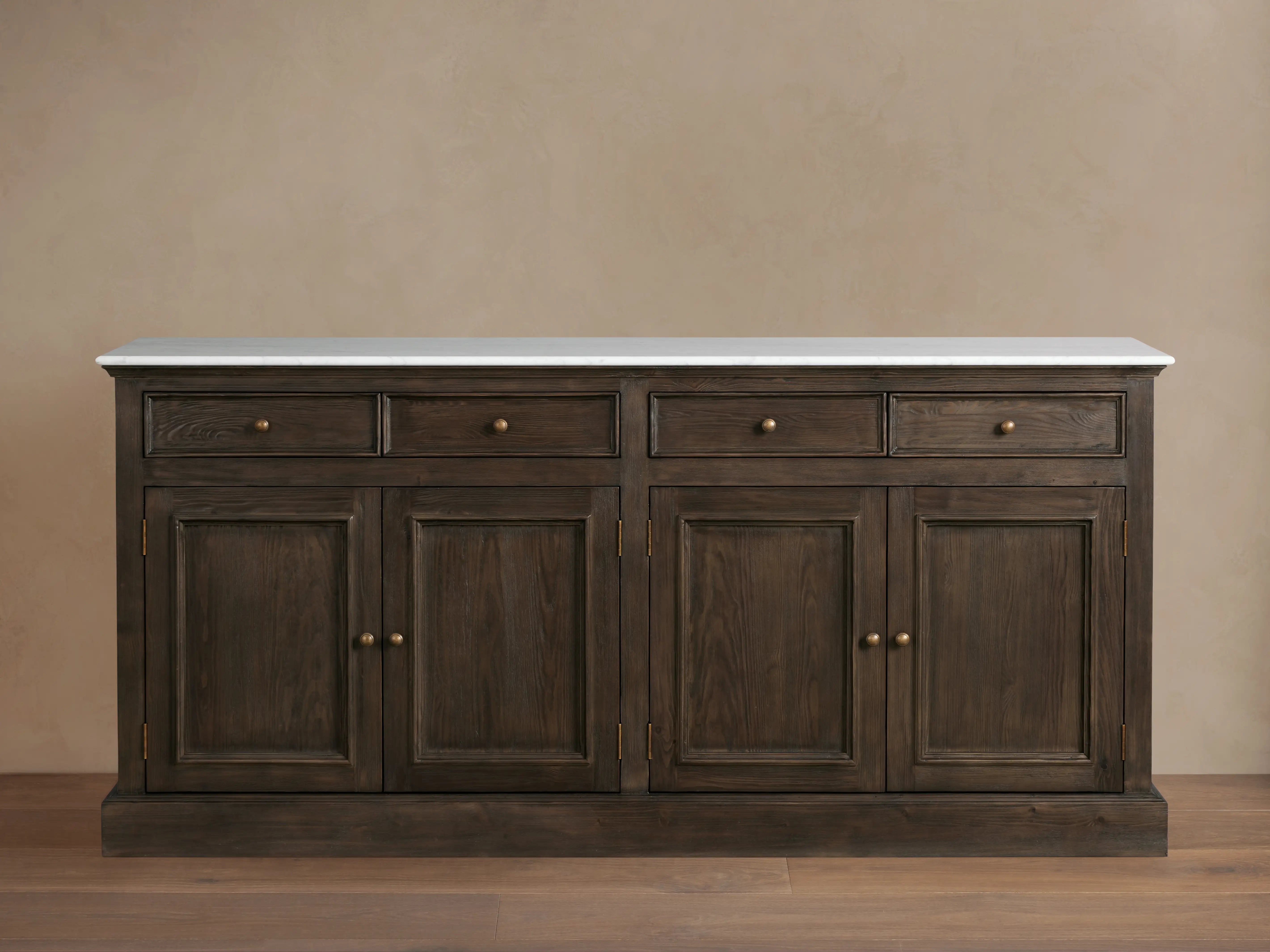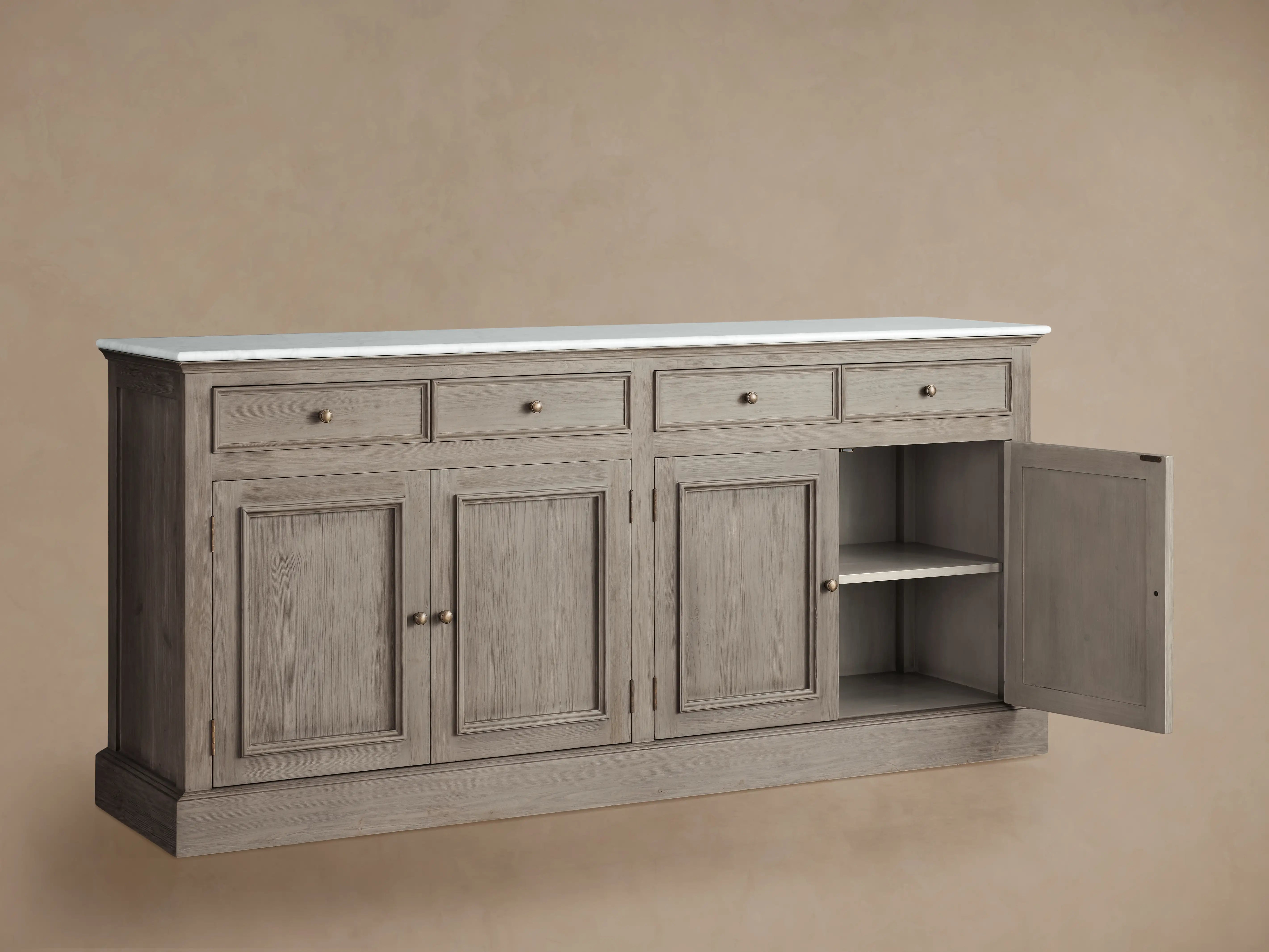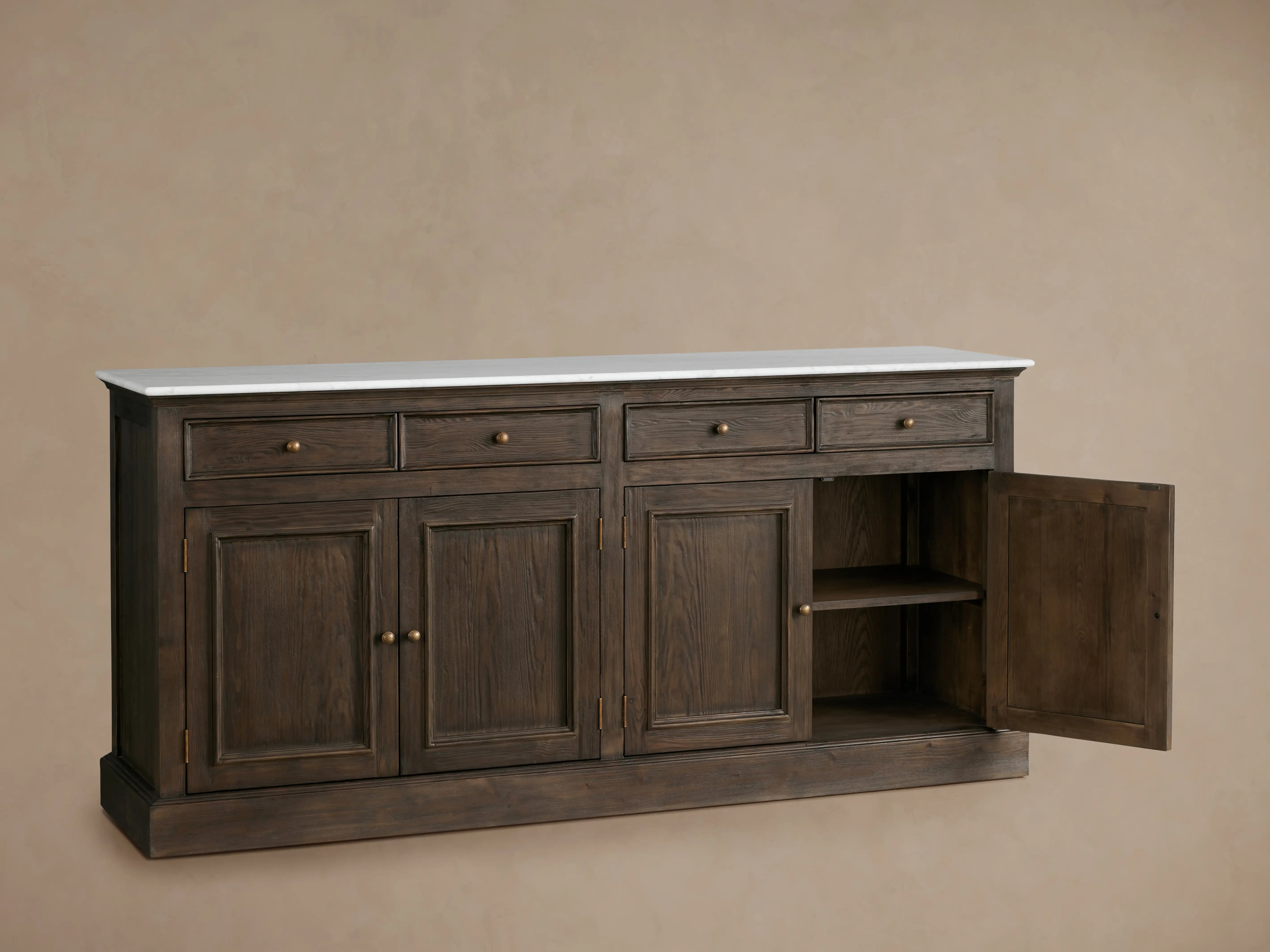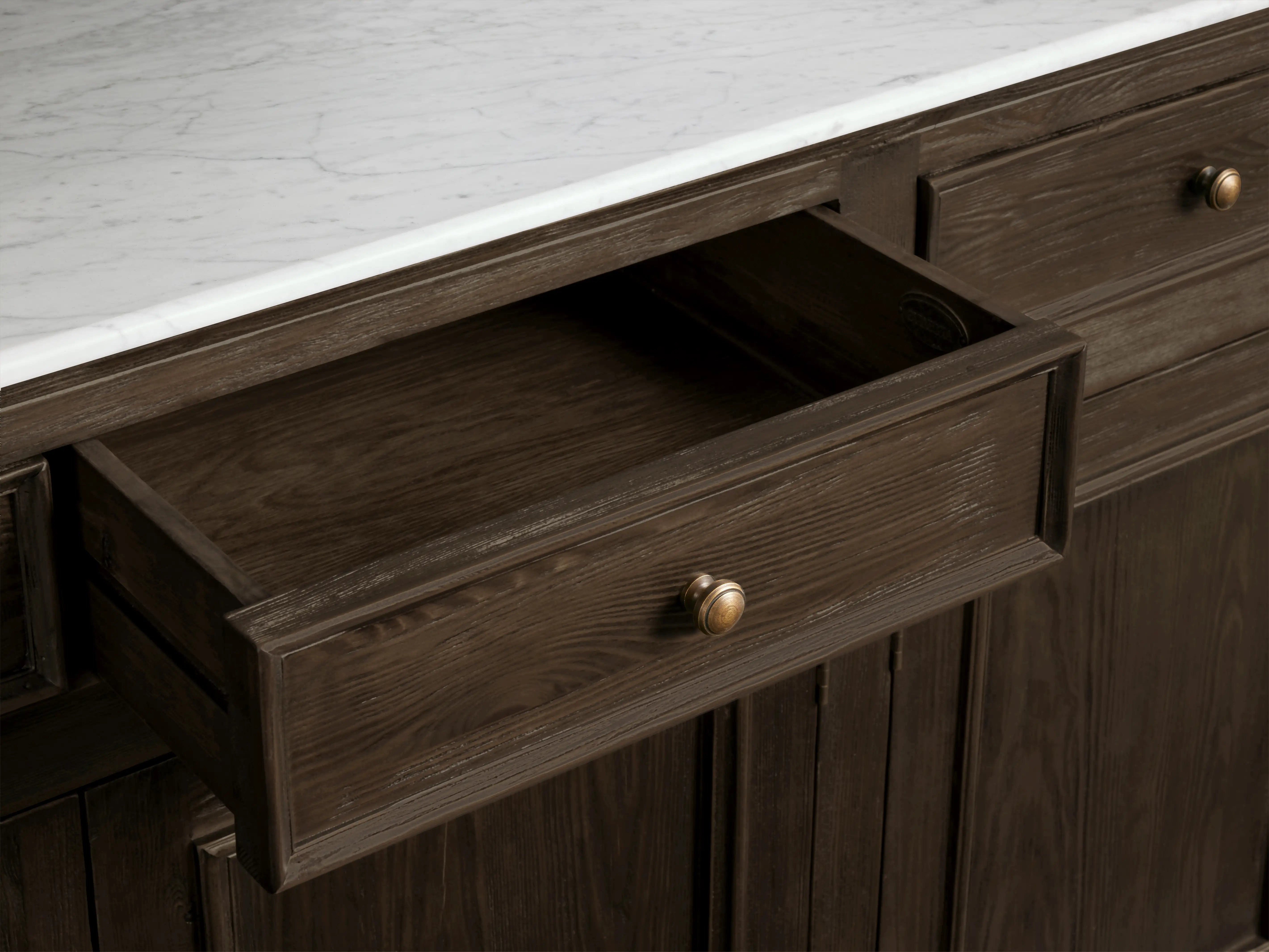 The Kensington Buffet is artisan crafted from solid, sustainably sourced Finnish pine wood, designed to bring timeless character and functional storage to dining spaces. Smooth bluestone or white marble tops add contrast and refinement, while layered stains and hand distressed detailing highlight the natural grain and texture of the wood.