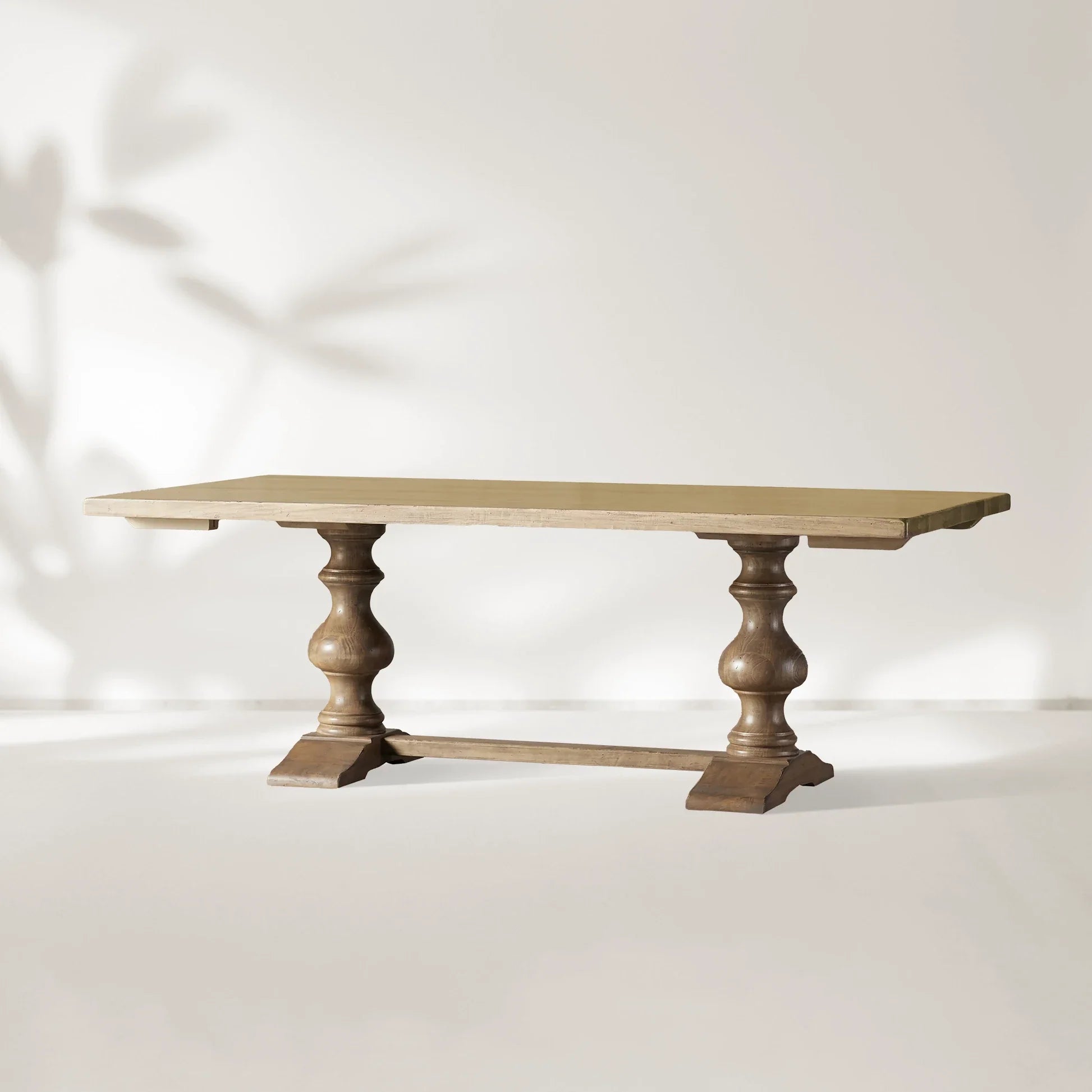 The hand-turned pedestal legs and hand-sculpted crown molding add architectural interest, while the horizontal trestle connects the legs, creating a distinctive silhouette. The table¡¯s finish is a carefully distressed antique effect, applied by hand to highlight the natural beauty of the wood. A final lacquer coating provides added protection and a subtle sheen.