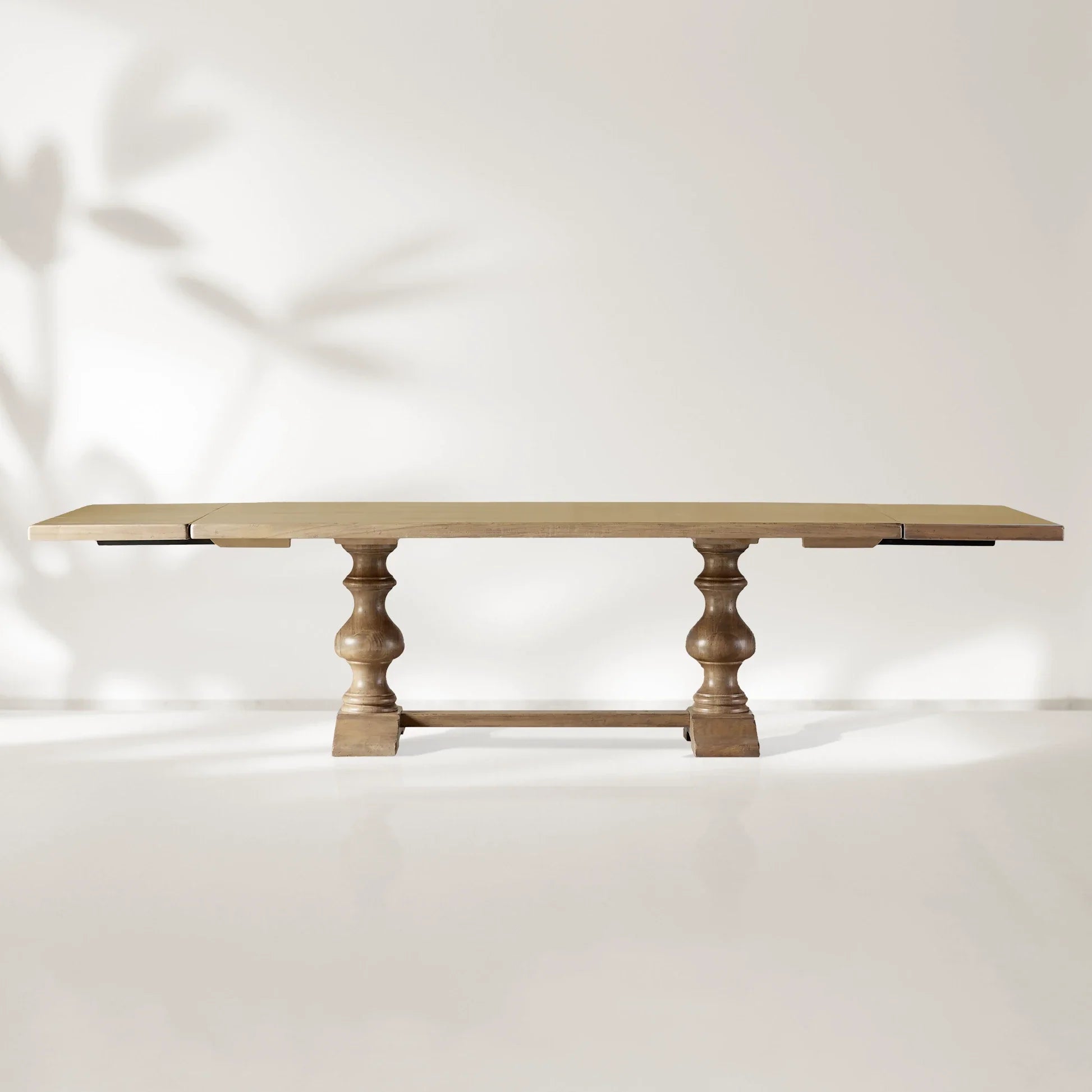 For added character, vintage-inspired brass pharmacy handles accentuate the extensions, and two 20" leaves are included, though they are not self-storing.