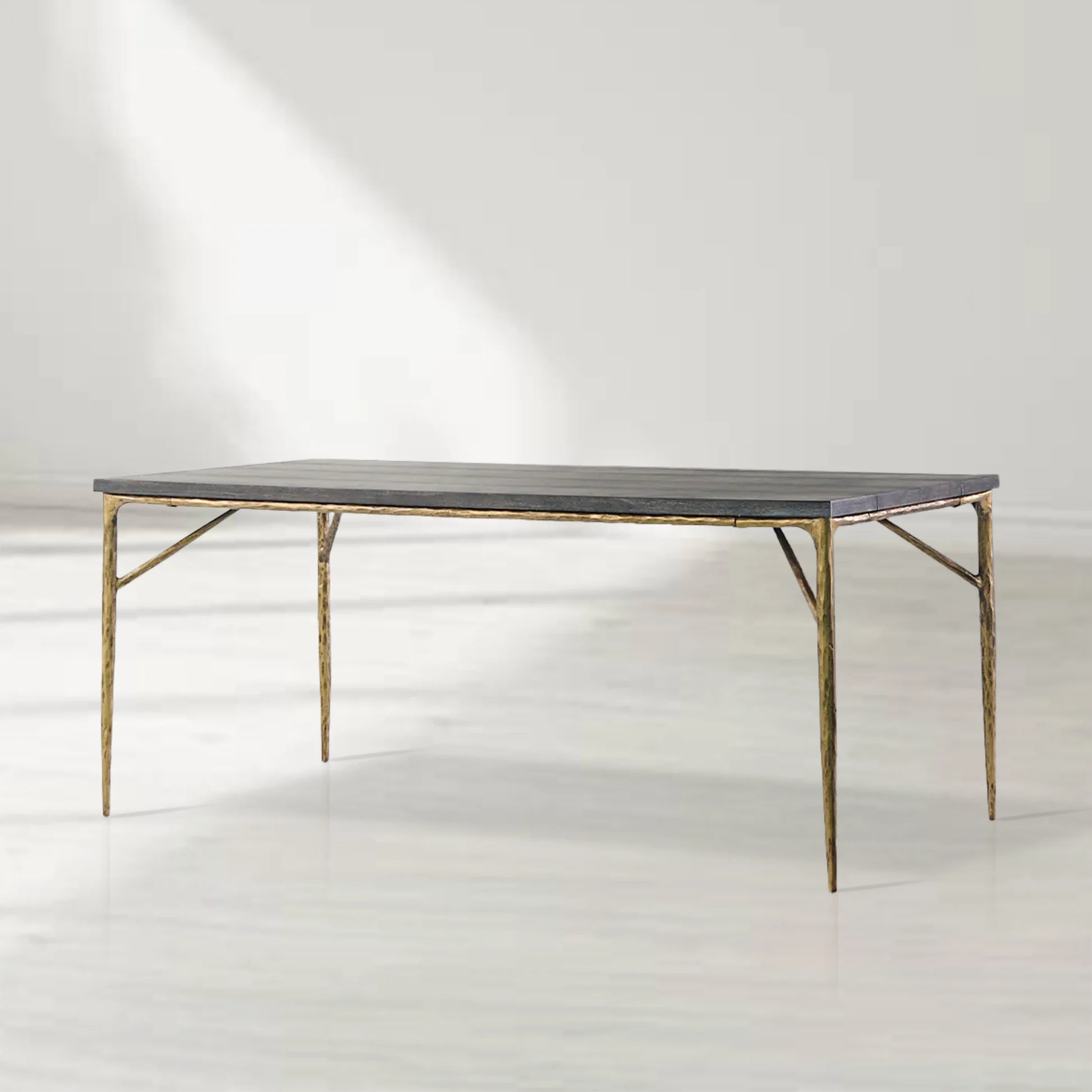This rectangular dining table uses contrasting materials to create a unique industrial modern design. The solid wood countertop is supported by a slender vintage copper and iron frame for a transparent appearance.